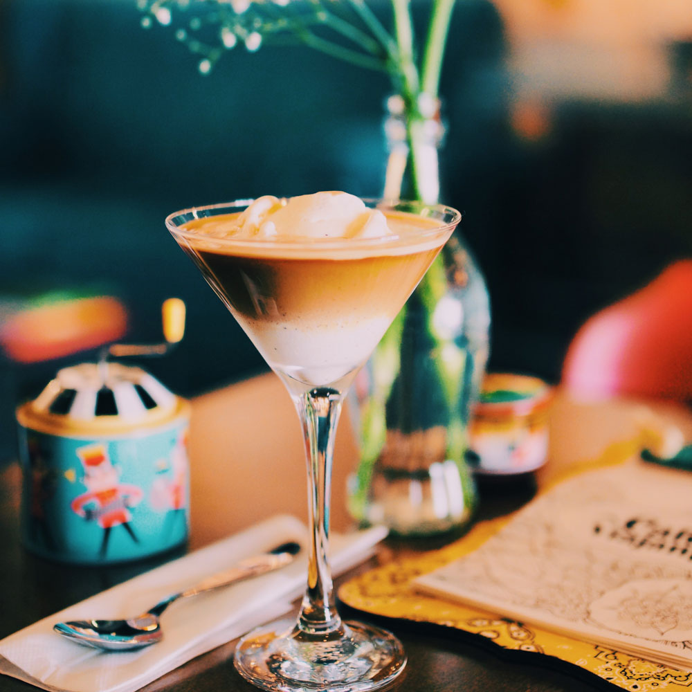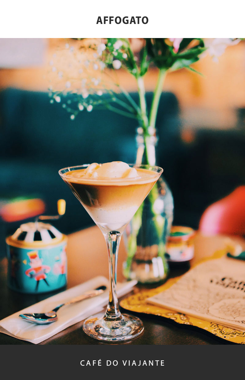 Nosso clássico gelato da casa servido com espresso lungo em uma taça de martini.